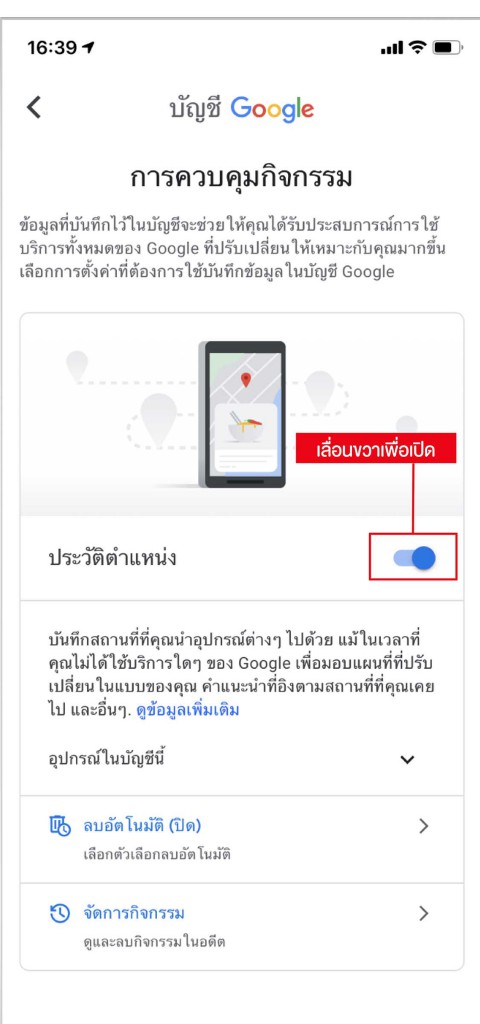 5.เลือนขวาปุ่มสีฟ้าเพื่อเปิด “ประวัติตำแหน่ง” เพื่อให้สมาร์ทโฟนบันทึกแผนที่และเส้นทางที่เราเดินทางไปแม้ไม่ได้ใช้บริการใดๆ ของ Google