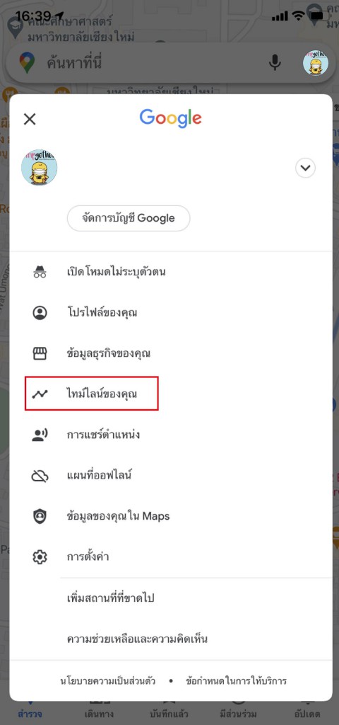 6.กดปิดหน้า “ข้อมูลของคุณใน Maps” และเลือก “ไทม์ไลน์ของคุณ” เพื่อเช็คไทม์ไลน์ว่าเราเดินทางไปที่ไหนมาบ้างและพื้นที่ไหนมีคนติดโควิด-19 บ้าง
