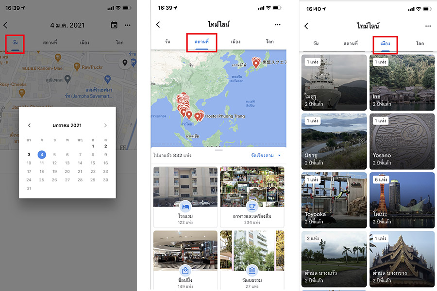 7.เมื่อต้องการดูไทม์ไลน์ สามารถย้อนดูได้ โดยกดที่รูปปฎิทินมุมขวาบน และเลือกวันที่เพื่อนๆ ต้องการเช็ค หรือเลือกเป็นสถานที่ที่เคยไป เมืองที่เคยไป อย่างสะดวกสบาย
