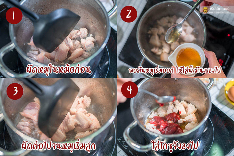 • ผัดหมูในหม้อให้สุกเล็กน้อย พอมันหมูเริ่มออกให้ใส่น้ำมันงาลงไป 2 ช้อน จากนั้นผัดต่อจนหมูเริ่มสุกแล้วใส่โกซูจัง 3 ช้อน