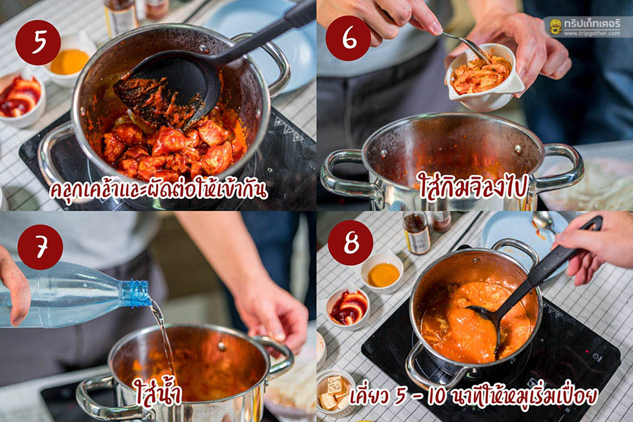 • คลุกเคล้าจนโกชูจังเข้าเนื้อ แล้วใส่กิมจิ 200 กรัมลงไป คลุกเคล้าอีกเล็กน้อย เติมน้ำเปล่าประมาณ 400 – 600 ml หากชอบรสจัดก็ใส่น้อยหน่อย เคี่ยวต่อไปประมาณ 5 – 10 นาทีจนหมูเริ่มเปื่อย