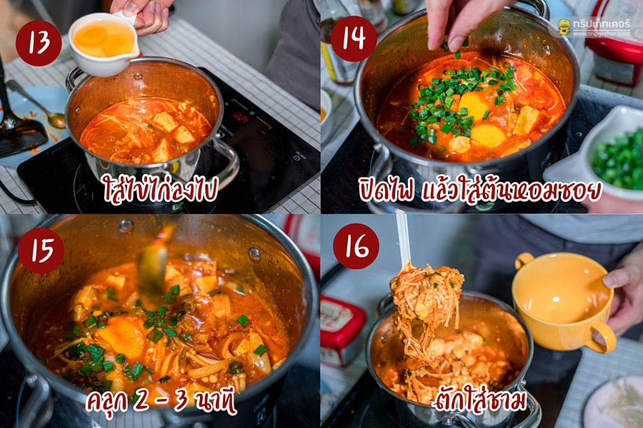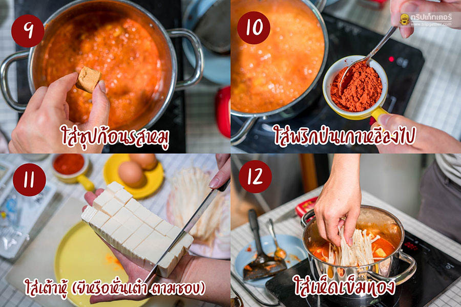 • ใส่ซุปก้อนรสหมู 1 ก้อน เคี่ยวจนซุปก้อนละลาย จากนั้นเติมพริกป่นเกาหลีลงไป 4 ช้อนชา คลุกเคล้าจนเข้าเนื้อแล้วจึงใส่เต้าหู้อ่อน (ยีหรือหั่นเต๋าตามชอบ) ตามด้วยเห็ดเข็มทอง แล้วเคี่ยวต่อสักพักให้เห็ดสุกเข้าเนื้อ