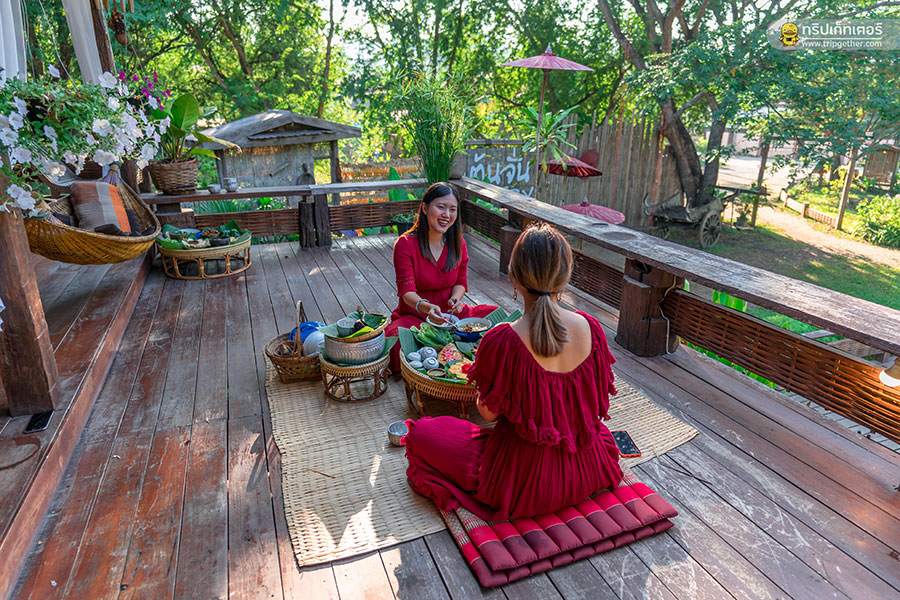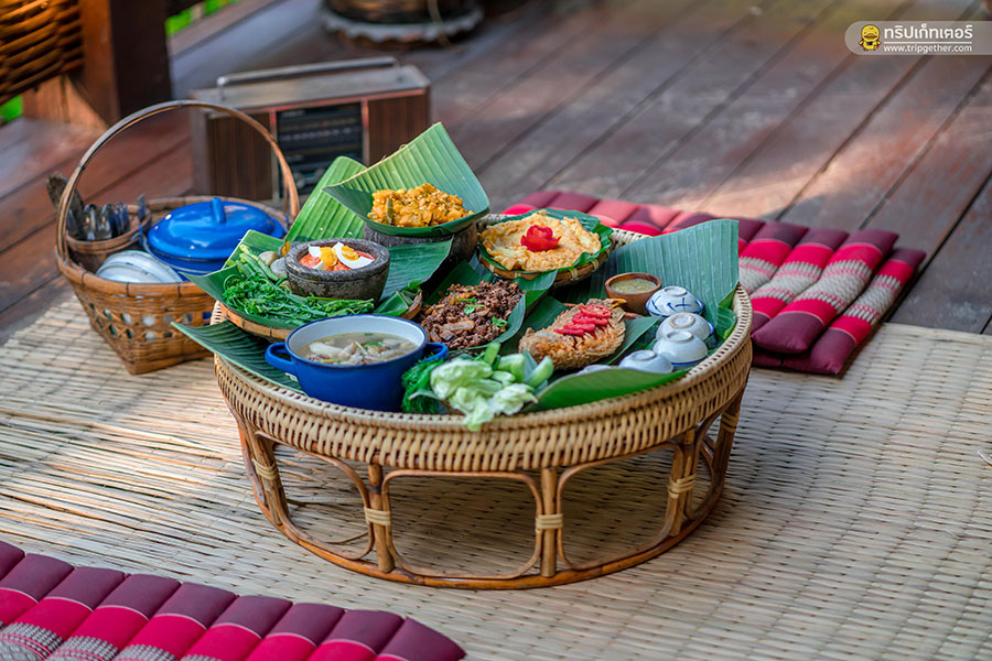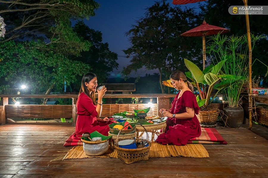 อีกหนึ่งความพิเศษของที่นี่คือ อาหารเย็นแบบจัดเต็มที่ยกเสิร์ฟมาบนขันโตก มีทั้งอาหารเหนือ อาหารภาคกลาง ให้จัดเต็มกันถึง 6 เมนูครบทั้งต้ม ผัด แกง ทอด และตบท้ายด้วยผลไม้สดๆ ที่บอกเลยว่ามื้อนี้อิ่มใจอิ่มพุงเป็นที่สุดเลย
