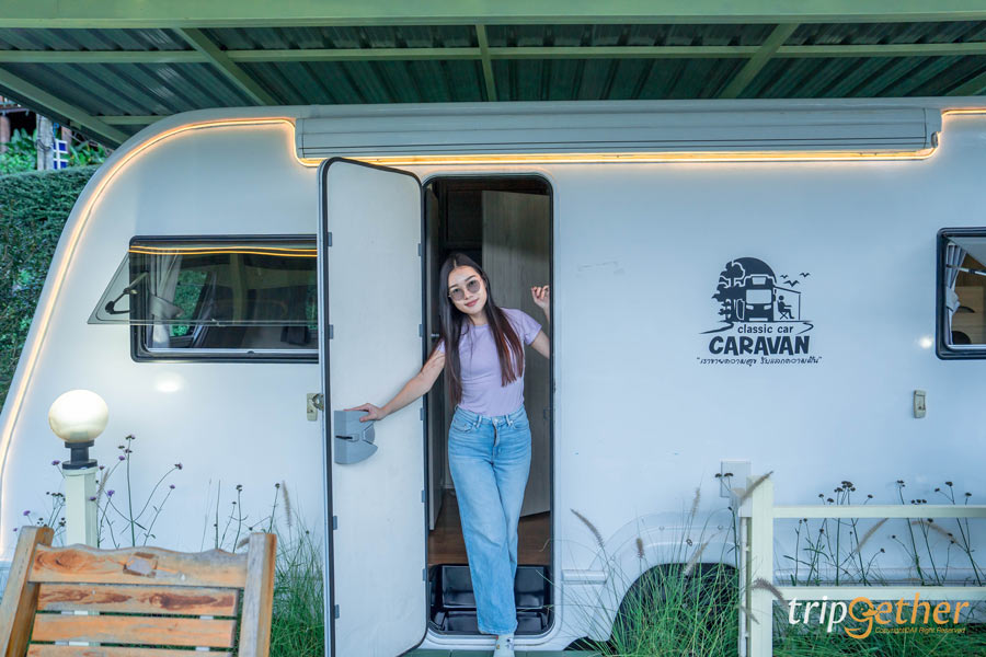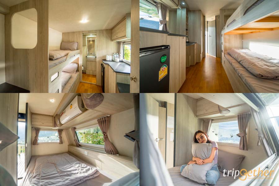 โดยวันนี้เราเลือกที่พักแบบรถบ้าน อยากได้ฟีลแกลมป์ปิ้ง เหมือนในหนังต่างประเทศเลย ภายในเป็นโทนไม้ดูอบอุ่น สบายตา ถึงจะเป็นรถบ้าน แต่สามารถรองรับได้ถึง 4 คนเลย แต่ถ้ามาเกิน 4 คน ก็สามารถกางเต็นท์หน้าระเบียงได้ ส่วนสิ่งอำนวยความสะดวกภายในรถบ้านมีครบครัน ทั้งทีวี ตู้เย็น กาน้ำร้อน แก้วน้ำ น้ำดื่ม กระดาษทิชชู่ ผ้าเช็ดตัว สบู่ แชมพู ไดร์เป่าผม ห้องน้ำในตัว เรียกได้ว่า สะดวกสบาย นอนฟินสุดๆ เหมือนอยู่บ้านตัวเองเลยล่ะ