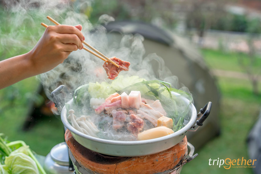 สำหรับหมูกระทะจัดมาเป็นชุดมีทั้งเนื้อสัตว์ ผักสด น้ำจิ้มพร้อม อย่ารอช้า ลงมือปิ้งกันเลย จะบอกว่ามื้อเย็นสำหรับวันนี้เป็นอะไรที่ฟินมากอ่ะ เราเหมือนคีบหมูกระทะอยู่ท่ามกลางขุนเขา น้ำตก อากาศเย็นพัดผ่านตลอดเวลา แต่เราก็ยังได้ไออุ่นจากเตาถ่าน แสงไฟสีนวลจากที่ประดับประดาที่พักให้สวยงามแข่งกับดาวบนฟ้าเลยทีเดียว
