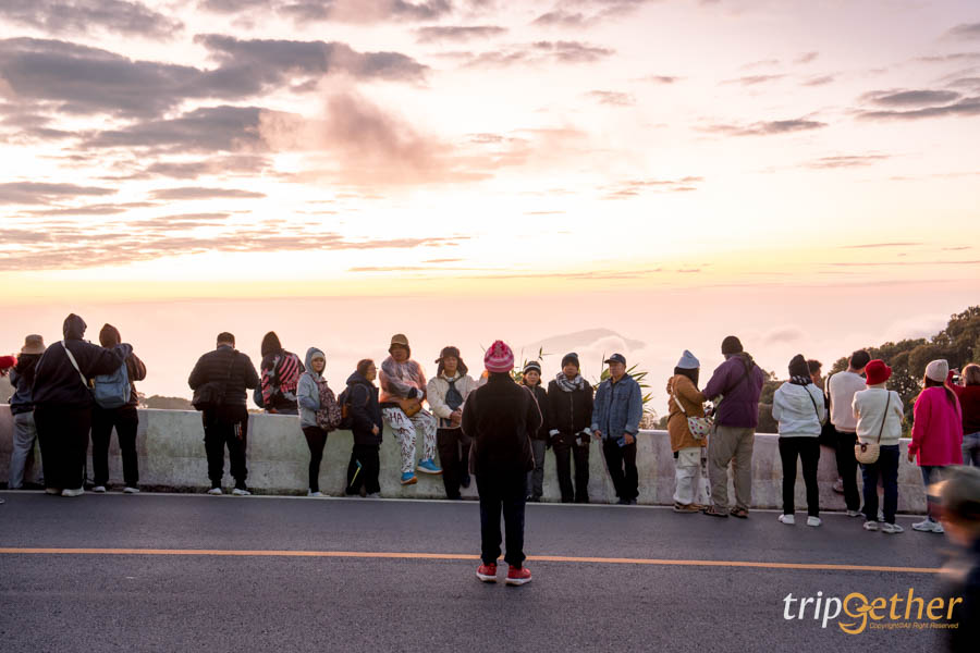 พอเรามาถึงที่จุดชมวิวกิ่วแม่ปาน มีนักท่องเที่ยวมายืนรอชมความงามของทะเลหมอกยามเช้าจำนวนมาก ทะเลหมอกเวลานี้มีสีส้มอมแดงได้ฟีลอบอุ่น รับเช้าวันใหม่ เราจึงไม่พลาดที่จะขอโพสท่าสวยๆ พร้อมกับแสงแดดยามเช้าที่สดใส