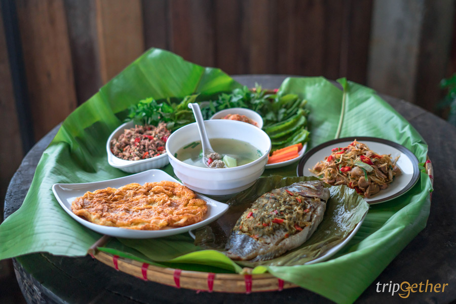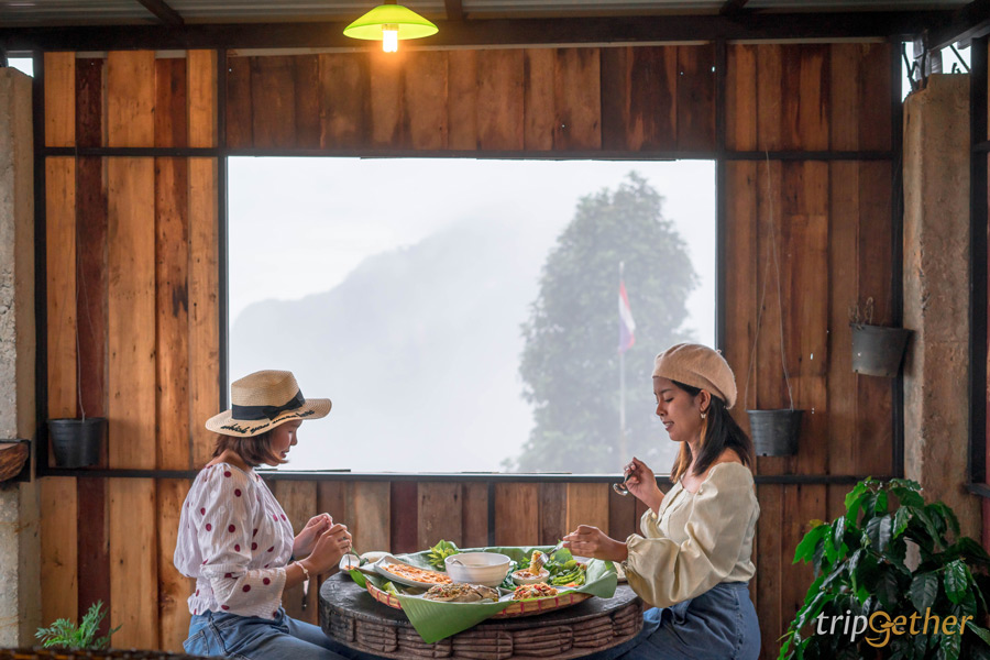 นั่งอินกับบรรยากาศสวยๆ จนถึงเย็นก็ได้เวลากินข้าวอีกแล้ว สำหรับมื้อนี้ทางโฮมสเตย์ได้จัดเตรียมเป็นชุดอาหารพื้นเมืองให้รับประทาน โดยราคาอาหารจะรวมอยู่ในราคาที่พักแล้ว ราคาคนละ 800 บาท ราคาห้องพักรวมอาหารเช้า (ข้าวต้มหมู+ไข่ลวก) และอาหารเย็น เซ็ตอาหารพื้นเมือง 6-7 อย่าง ฟรีกาแฟดริป และเครื่องดื่มในร้านคนละ 1 เมนูอีกด้วย