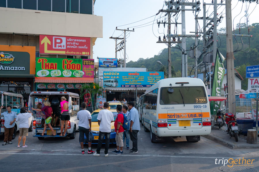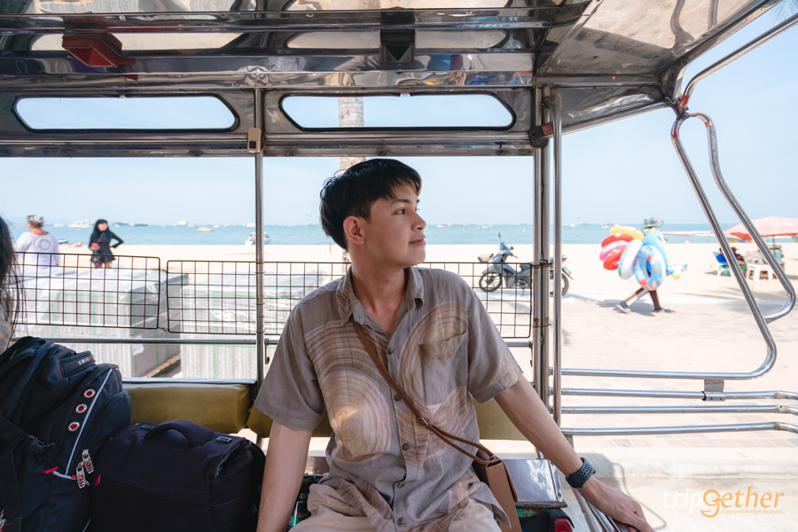 พอถึงพักเข้าห้องน้ำกันแล้ว เราก็เดินทางกันต่อด้วยรถสองแถว ที่จะมีจอดอยู่หน้าสถานีรถไฟเลย ซึ่งค่าบริการจากสถานีรถไฟพัทยา – ท่าเรือแหลมบาลีฮายจะอยู่ที่คนละ 50 บาท (ปกติแล้วรถจะออกตอนที่มีผู้โดยสารหลายคนหน่อย)
