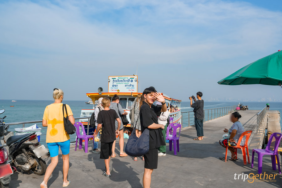 เรานั่งรถมาถึงที่ท่าเรือแหลมบาลีฮายเกือบๆ เที่ยงพอดี เลยต้องรีบเดินไปขึ้นเรือเมล์ที่ท่าด้านในเพื่อข้ามไปยังเกาะล้าน ราคาอยู่ที่คนละ 30 บาท และที่ว้าวสุดๆ คือเดี๋ยวนี้เขารับสแกนจ่ายได้แล้วนะ