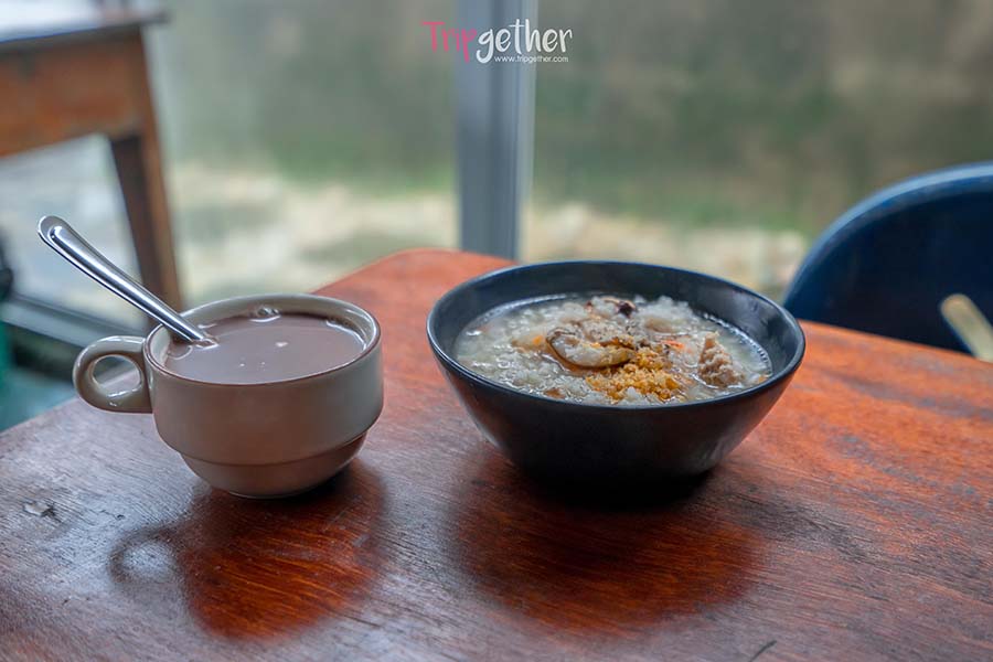 ในส่วนของอาหารเช้าที่อีต่องโอมสเตย์มาแบบเรียบง่าย มีข้าวต้มไก่ ขนมปัง และกาแฟ เติมพลังพร้อมลุยปล๊อกกันต่อ
