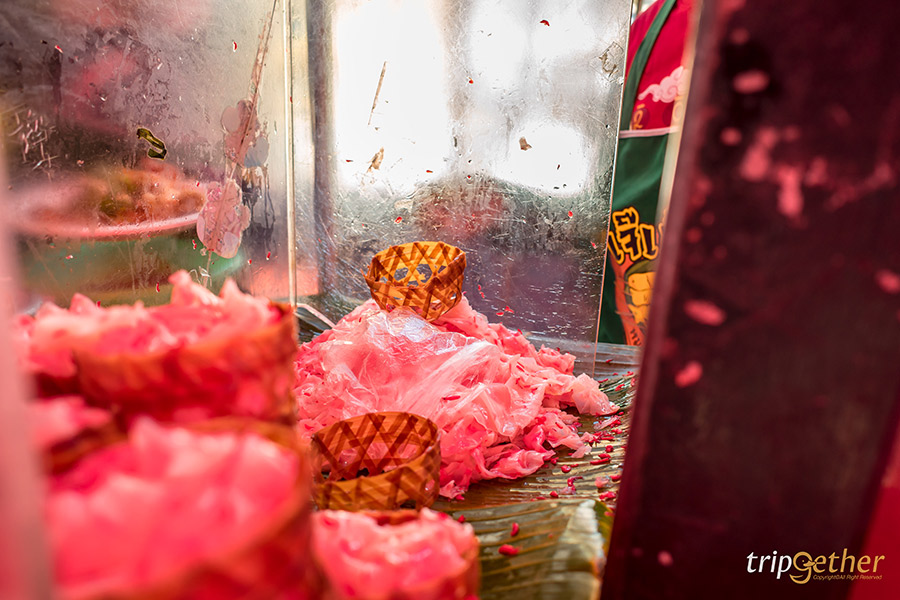 ไหว้ศาลเจ้าแม่ประดู่เสร็จ เราก็เดินลัดเลาะมาเรื่อยๆ ที่ถนนแปลงนาม เพื่อจะมาลิ้มรสความอร่อยสุดร่ำลือของขนมจีบแป๊ะเซียะ ร้านขนมจีบรถเข็นในตำนาน ซึ่งจะตั้งขายอยู่หน้าวัดมงคลสมาคม พอเดินมาถึงก็รู้ได้ทันทีเลยว่าคือร้านของอาแป๊ะเซี๊ยะจริงๆ เพราะคนต่อคิวยาวมาก! ต่อคิวได้สักพักก็อกหักดังเปร๊าะ เพราะอาแป๊ะเซี๊ยะบอกว่าขนมจีบน่าจะมีไม่พอแล้ว เสียใจสุดๆ แนะนำว่าถ้าใครอยากชิม อาจจะต้องมาเร็วๆ หน่อยนะ
