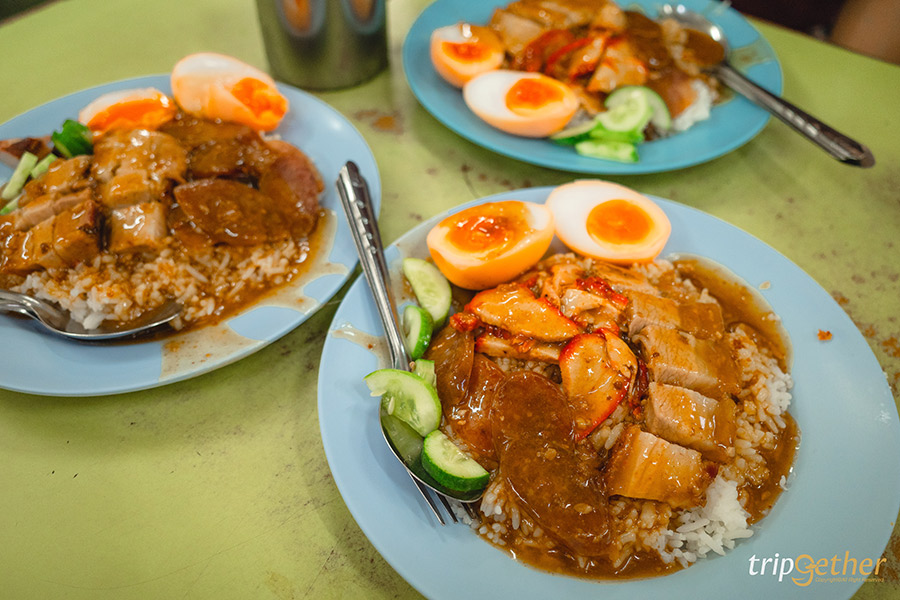 เลือกที่นั่งได้แล้ว จะรออะไร ก็สั่งไปเลยข้าวหมูแดงหมูกรอบ ใส่กุนเชียงและไข่ต้มจุกๆ แอบกระซิบเลยว่าถูกมาก จานละ 65 บาทเท่านั้น! ส่วนน้ำก็จะเป็นน้ำชา สามารถขอน้ำแข็งเปล่าได้เลย 2 บาทเท่านั้น