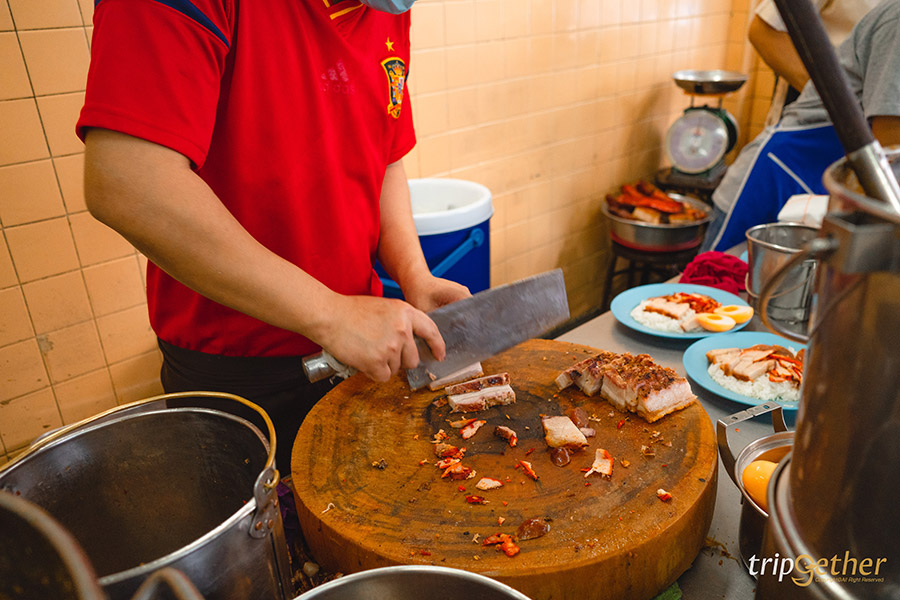 ความโดดเด่นของร้านอยู่ที่กรรมวิธีการทำหมูแดงและหมูกรอบ ซึ่งจะเลือกใช้เนื้อสัน แล้วนำมาย่างด้วยเตาถ่านเพื่อเพิ่มความหอมและรสสัมผัสที่นุ่ม จากนั่นก็จะหั่นเป็นชิ้นใหญ่พอดีคำ บอกเลยว่าแค่อยู่หน้าร้านกลิ่นก็หอมโชยมาแล้ว แถมลูกค้ายังเข้ามาเรื่อยๆ แบบไม่พักอีกต่างหาก