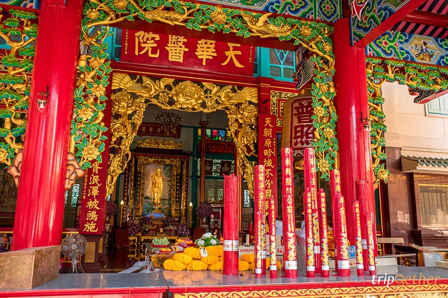 ไหว้ตามจุดทั้ง 3 เรียบร้อย เราก็เข้ามาในวิหารเพื่อมาขอพรกับเจ้าแม่กวนอิมกันอีกสักครั้ง โดยเชื่อกันว่าเจ้าแม่กวนอิมคือพระโพธิสัตว์แห่งความเมตตา อีกทั้งศาลเจ้าแม่กวนอิมแห่งนี้ยังขึ้นชื่อในเรื่องของความศักดิ์สิทธิ์ในด้านสุขภาพ จึงมีผู้คนจำนวนมากมากราบสักการะขอพรให้หายป่วย ปราศจากโรคภัยกันเป็ยจำนวนมาก