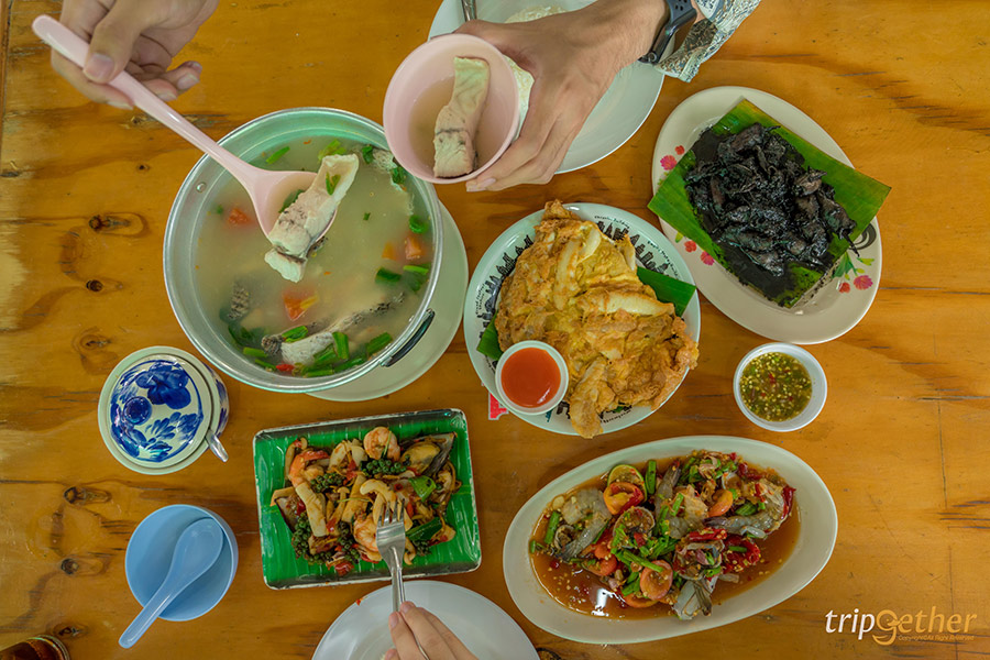 พอเดินเข้ามาในร้านก็ได้กลิ่นหอมของอาหารแล้ว และเมนูที่เลือกสั่งกันก็คือ หมึกผัดน้ำดำ ต้มยำปลากะพง ไข่เจียวไข่หมึก ตำเกาเหลาทะเล และผัดฉ่าทะเล แนะนำเลยว่าใครมาถึงร้านป้าสร้อยแล้วห้ามพลาด เพราะวัตถุดิบของร้านคัดมาสดๆ ใหม่ๆ จากทะเลทุกวัน การันตีความอร่อยได้เลย