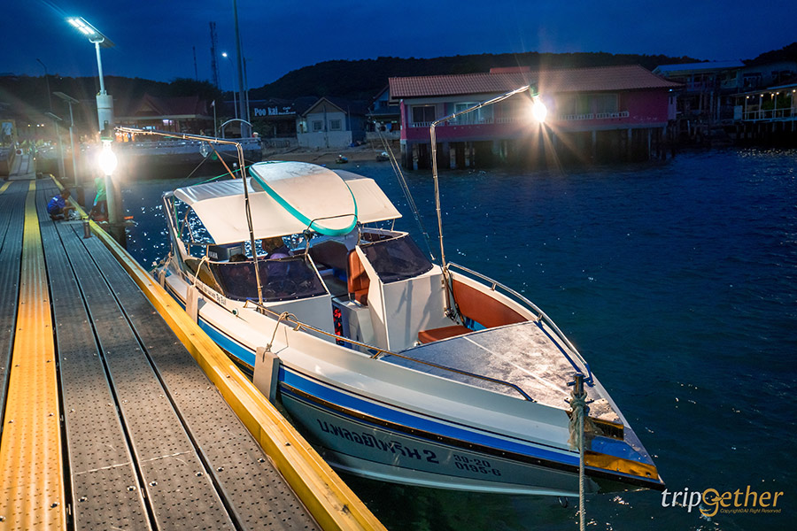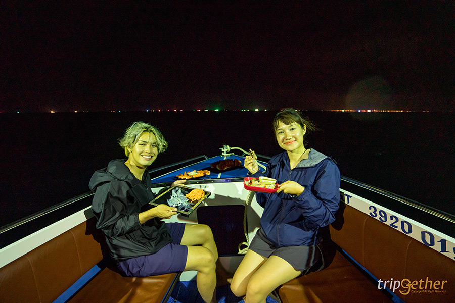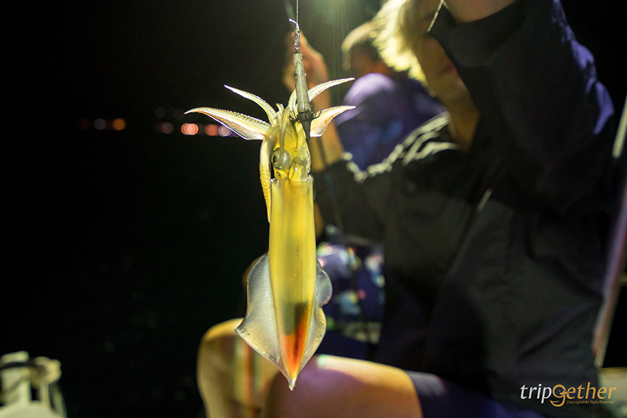 หลังจากที่เรากินมื้อเย็นกันแล้วกิจกรรมในค่ำคืนนี้ของเราคือการไปตกหมึก กิจกรรมนี้มีค่าใช้จ่ายเพิ่มเติมไม่รวมกับแพ็คเกจที่เราซื้อไว้นะ การไปตกหมึกครั้งนี้เราเลือกไปแบบจอยทริปเพราะว่าเราไปแค่ 2 คน ก็เลยไปรวมกับคนอื่นๆ ด้วย ค่าเรือออกไปตกหมึกจะอยู่ที่ 4,500 บาท ราคานี้สำหรับ 1 – 6 คน คนที่ 7 ขึ้นไปจ่ายเพิ่มคนละ 500 บาท เรือสามารถนั่งได้ 10 คน แต่ไม่เกิน 12 คน ใช้เวลาออกไปตกหมึกประมาณ 3 – 4 ชั่วโมง