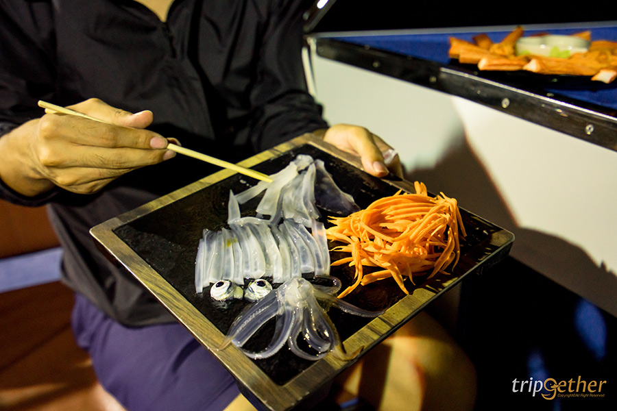 หมึกสดๆ จากทะเล หวานมาก กินคู่กับน้ำจิ้มซีฟู้ดหรือจิ้มวาซาบิก็อร่อยหมด ถ้าใครอยากมาตกหมึกแบบเราสามารถแจ้งกับทางที่พักได้เลย