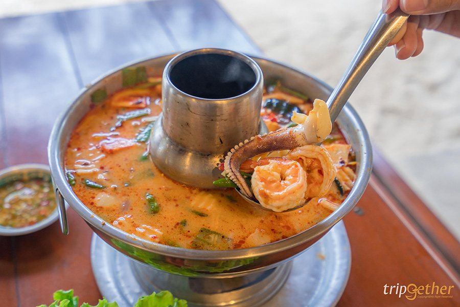 ต้มยำทะเลน้ำข้น รสชาติแซ่บถึงเครื่องต้มยำพร้อมกับกุ้งและหมึกชิ้นใหญ่เต็มคำ