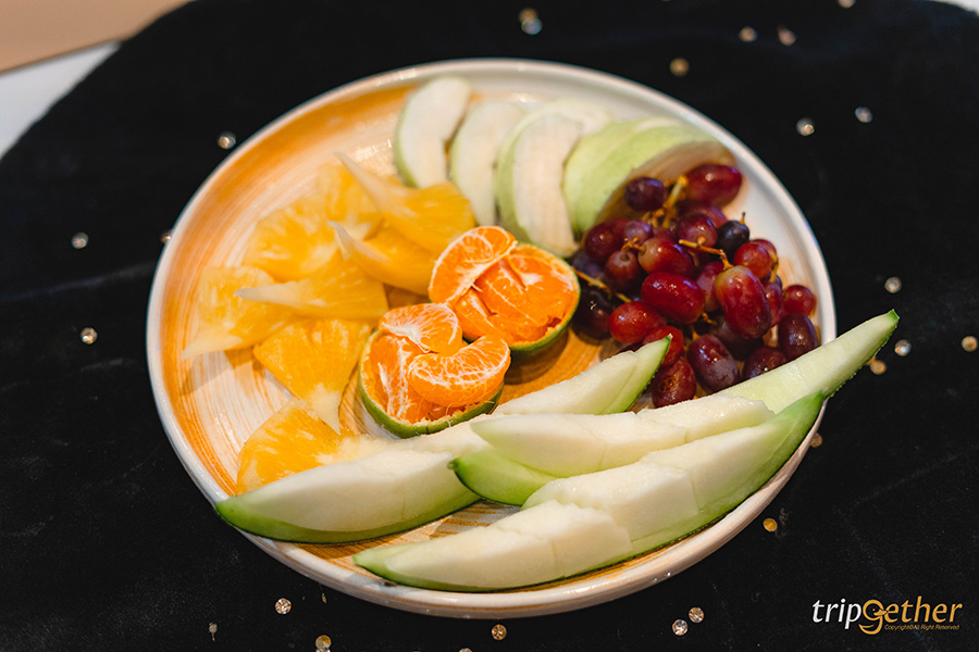 หลังจากได้เยี่ยมชมวิถีการเกษตรกรแล้ว ทางฟาร์มก็มีของว่างปิดท้ายด้วยผลไม้หวานฉ่ำ และน้ำผลไม้ที่ใช้ผลผลิตจากฟาร์มเองด้วย