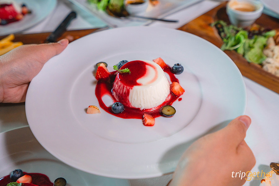 ของหวานปิดท้ายด้วยพานาคอตต้าซอสสตรอว์เบอร์รี่