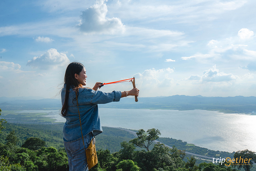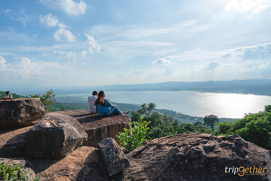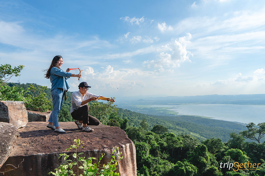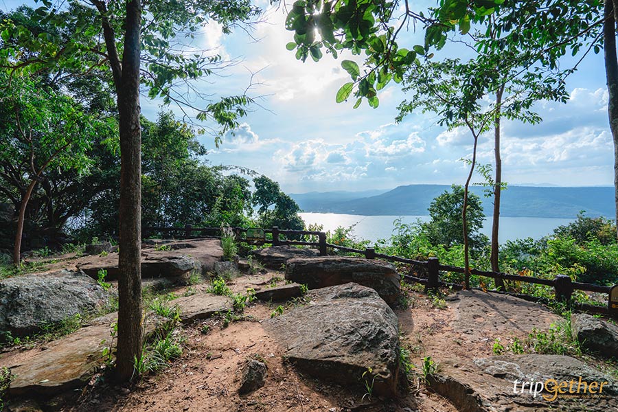 ไปทำกิจกรรมกันต่อที่จุดชมวิวผายายเที่ยง โดยเราต้องเดินผ่านเนินเขาขึ้นไป บอกเลยว่าภาพวิวปลายทางริมหน้าผาที่รอเราอยู่ช่วยสลายเอาความเหนื่อยระหว่างการเดินขึ้นมาหายลับไปในทันใด เพราะภาพที่เราเห็นคือผืนน้ำสลับกับพื้นที่โล่งสุดกว้างไกล พร้อมกับเห็นแนวเขาเป็นฉากตัดกับท้องฟ้า ถือเป็นจุดอันซีนวิวหลักล้านที่น่าประทับใจเป็นอย่างมาก