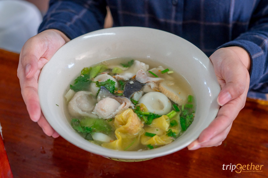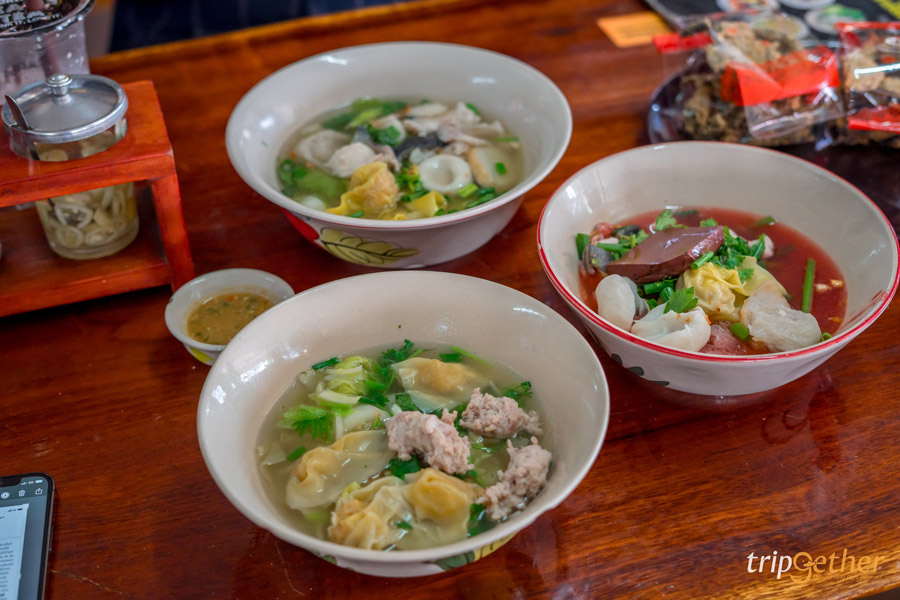 ที่นี่จะมีเมนูเด็ดเป็นเกาเหลาเลือดหมู แต่เมนูที่เราสั่งกันจะเป็น เกี๊ยวกุ้งปลารวม 70 บาท เย็นตาโฟปลารวม 60 บาท และเกี๊ยวหมูสับ 50 บาทความอร่อยของร้านนี้ขอให้ 10/10 เลย น้ำซุปเคี้ยวจนหอม ให้เครื่องเยอะด้วยและที่สำคัญราคาไม่แพงด้วย