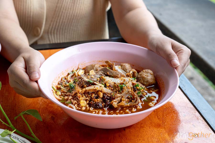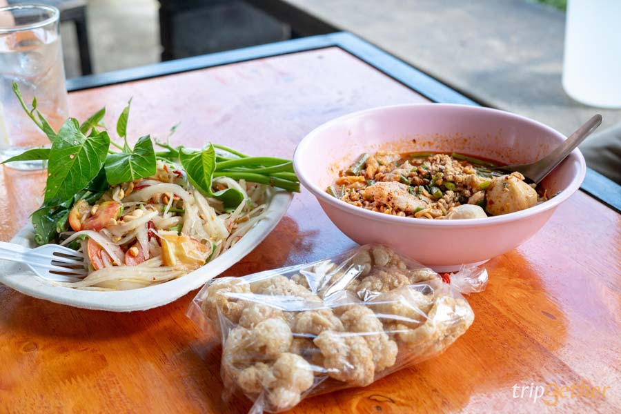 ที่ร้านจะขายเป็นเมนูตามสั่งและก๋วยเตี๋ยว ส่วนรูปเมนูส้มตำเดินไปซื้อจากอีกร้านมานั่งกิน ก๋วยเตี๋ยวตำยำหมูราคา 50 บาท ก๋วยเตี๋ยวต้มนำเนื้อรวม 70 บาท ส้มตำไทย 50 บาท และแคบหมู 25 บาท