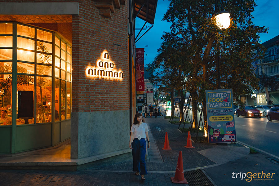 เก็บกระเป๋าเรียบร้อย แช่น้ำเย็นๆ ก็สบายตัวแล้ว มาเดินถ่ายรูปเก็บแสงสียามค่ำคื่นกันต่อที่ One Nimman เป็นแหล่งช้อปปิ้งสินค้า รวมร้านคาเฟ๋เก๋ๆ ของแฮนด์เมดชิคๆ นอกจากเดินช้อปปิ้งซื้อของแล้ว ตัวโครงสร้างอาคารที่มีการออกแบบดูโดดเด่นด้วยอิฐสีส้ม เป็นสถาปัตยกรรมยุโรปที่มีกลิ่นอายล้านนาผสมกันอย่างสวยงาม ยิ่งมาตอนเย็นอากาศกำลังสบายๆ บวกกับแสงจากหลอดไฟที่ประดับประดาตามจุดต่างๆ ใครสายถ่ายรูปทำคอนเทนต์ต้องแวะมาเก็บภาพกันแล้ว