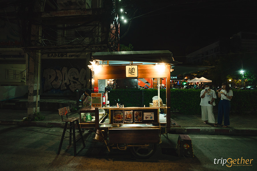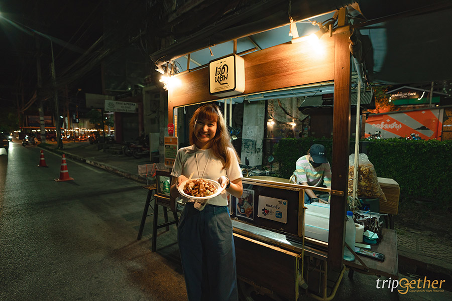 เดินตามถนนนิมมานมาเรื่อยๆ จนถึงหน้า Warmup Cafe แต่เป้าหมายวันนี้เราไม่ได้มาดื่มกัน! เดินเยื้องมาจากร้านเล็กน้อยจะเจอกับรถเข็นขายลูกชิ้นเล็กๆ ชื่อดังที่บอกเลยว่าใครมาเชียงใหม่ต้องแวะมากินให้ได้ ลูกชิ้นเห็ด-หอม เป็นร้านลูกชิ้นที่มีลูกชิ้นให้เลือกหลากหลายทั้ง ลูกชิ้นหมู ไก่ ปลา ราดซอสข้นๆ สูตรพิเศษจากทางร้าน จบด้วยการโรยเกี๊ยวทอดกรอบแบบจัดเต็ม แถมราคาก็ไม่แพงเลย โดยทางร้านจะมีให้เลือกทั้งหมด 3 ขนาด คือ S M และ L ราคาก็ 30 50 และ 100 บาทตามลำดับ บอกเลยคุ้มค่ามาก เดินกินชิลล์ๆ เคี้ยวเพลินๆ ระหว่างเดินทางกลับที่พักคือดีมาก