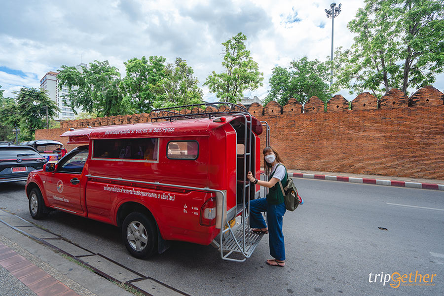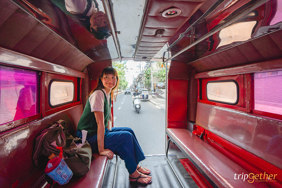 เดินเล่นถ่ายรูปมาเหนื่อยๆ ก็ถึงเวลาไปหาอะไรเย็นๆ ดับร้อนกันหน่อย คราวนี้เราเลือกที่จะโบกรถแดงกันอีกรอบซึ่งเป็นตัวเลือกการเดินทางในเมืองที่ง่ายมากเหมาะกับคนที่ไม่ได้ขับรถเที่ยว นอกจากนี้เรายังสามารถเห็นรถแดงจอดรับผู้โดยสารอยู่ทุกสถานที่ท่องเที่ยว ถ้าอยากไปที่ไหนเพียงแค่โบกๆ บอกจุดหมายปลายทาง คุยตกลงราคากันซึ่งราคาส่วนใหญ่เริ่มต้นที่ 30 บาท ถ้าทุกอย่างโอเคแล้วก็กระโดดขึ้นรถเลย