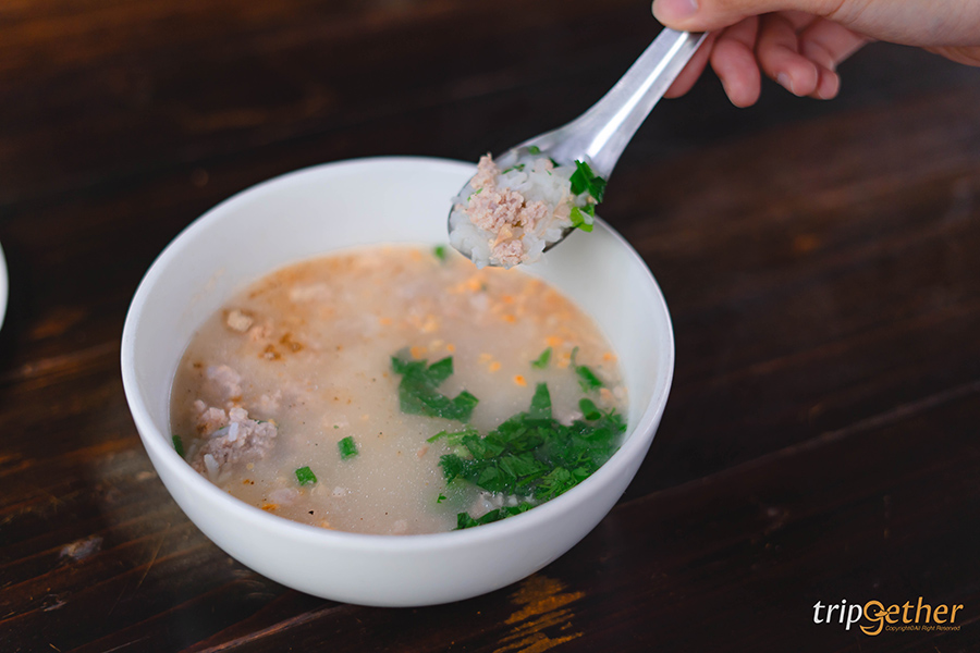 สำหรับอาหารเช้าของทางที่พักจะเป็นอาหารตามสั่งซึ่งสามารถเริ่มสั่งได้ตั้งแต่ 7 โมงเช้า และตอนเช้าแบบนี้ก็ต้องอุ่นท้องร้อนๆ ด้วยข้าวต้มสักชามเป็นการเริ่มทริปในวันสุดท้ายของเรา