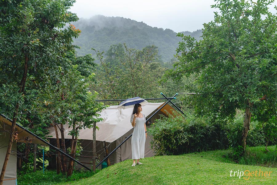 บรรยากาศหน้าเต็นท์กระโจมเพียงเปิดมาก็พบกับสนามหญ้าโล่ง วิวภูเขาที่มีสายหมอกคลอเคลีย และมองไปอีกนิดก็สามารถเห็นน้ำตกสิริภูมิได้เลย