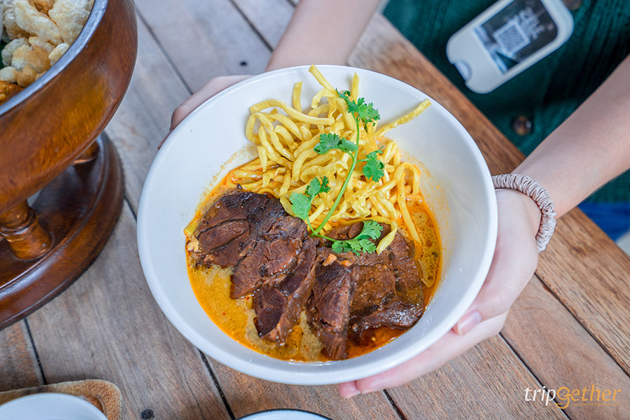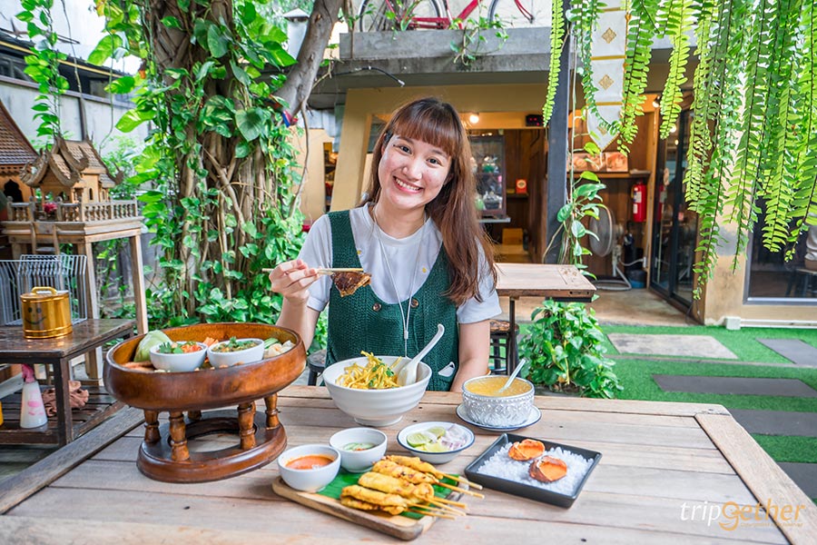 เมนูของร้านไม่ได้มีแค่ข้าวซอย แต่ยังมีเมนูของกินเล่น เครื่องดื่มสมุนไพร และของหวานให้ได้เลือกมากมาย และในเมื่อเป็นอาหารมื้อแรกของทริปก็ขอจัดเต็มหน่อย โดยเริ่มจากสั่งออเดิร์ฟเมืองที่เสิร์ฟมาบนขันโตก จิ้มผักกินคู่กับน้ำพริกหนุ่มและน้ำพริกอ่อง แกล้มด้วยไส้อั่วและแคบหมู บอกเลยว่าถ้ามาเชียงใหม่ต้องสั่งออเดิร์ฟเมืองให้ได้ นอกจากนี้เรายังสั่งไก่สะเต๊ะและอ่องปูมากินรองท้องก่อน