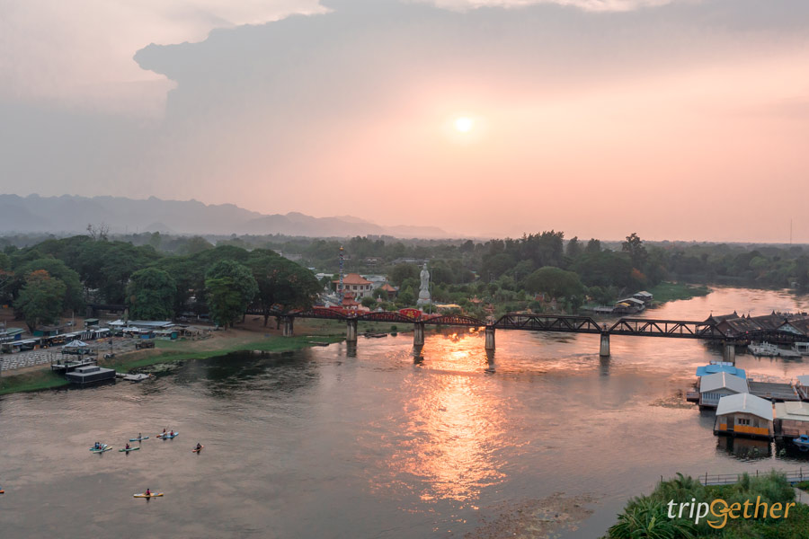 ท้องฟ้าอันสดใสที่อยู่กับเรามาทั้งวันค่อยๆ ถูกอาบด้วยแสงสีเหลืองละมุนของพระอาทิตย์ จนกลายมาเป็นสีวานิลลาแสนสวยงาม กับวิว 2 ฝั่งริมแม่น้ำแควใหญ่และแม่น้ำแม่กลอง ท่ามกลางบรรยากาศที่เงียบสงบ รู้สึกฮีลใจเป็นอย่างมาก ยกให้สะพานแม่น้ำแคว เป็นอีกหนึ่งพิกัดจุดชมวิวพระอาทิตย์ตกที่สวยงามสุดประทับใจ เชื่อว่าใครได้มาสัมผัสจะต้องหลงรักพระอาทิตย์ตกน้ำอย่างแน่นอน