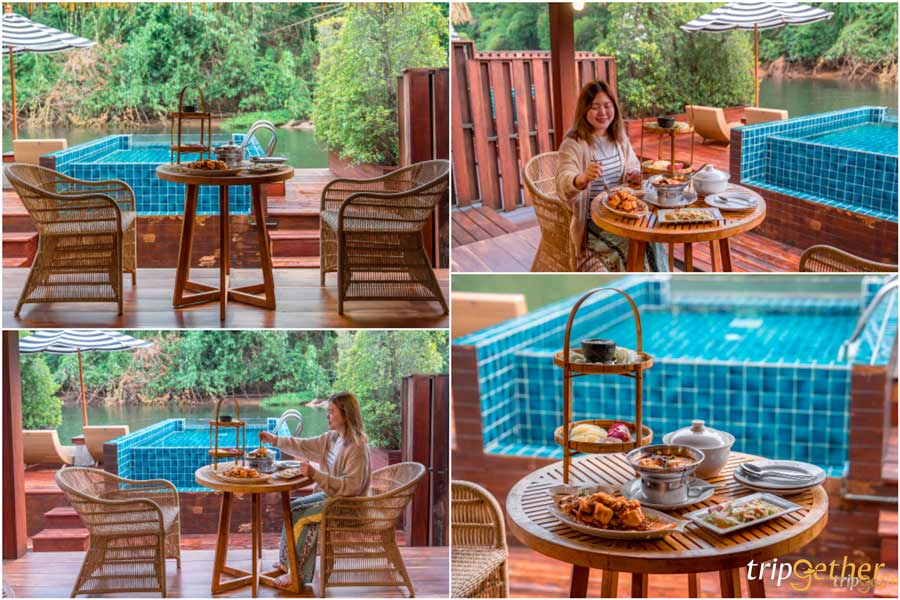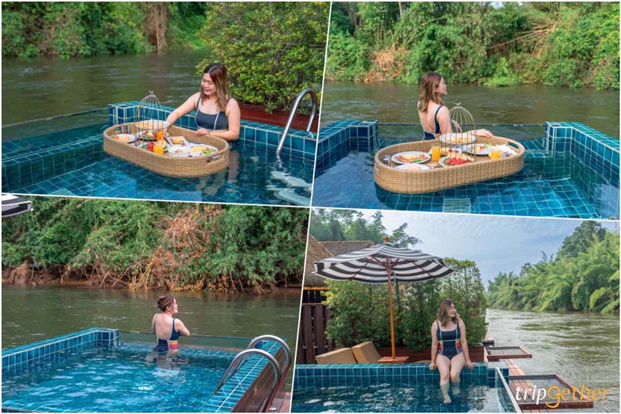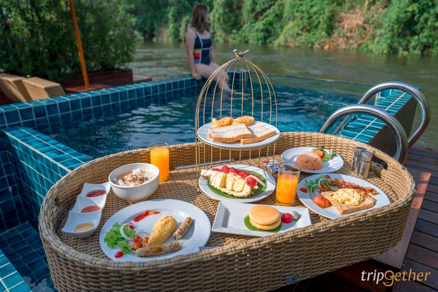 สวัสดีเช้าวันใหม่กับ ทริปเที่ยวกาญจนบุรี 2 วัน 1 คืน~ เมื่อคืนนอนหลับสบายมากๆ ชาร์จเเอนเนอร์จีอย่างเต็มเปี่ยม! เริ่มต้นวันใหม่ก็มีอาหารเช้ามาบริการถึงหน้าห้องแบบจัดเต็ม น่ากินทุกจาน ซึ่งจะมาในแบบของ Floating Breakfast ถาดอาหารลอยน้ำในสระส่วนตัว ที่เห็นแล้วอดถ่ายรูปไม่ได้จริงๆ อย่าลืมเตรียมชุดว่ายน้ำมากันด้วยนะ