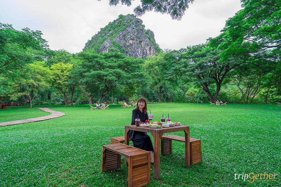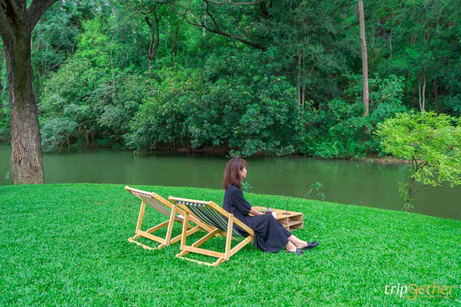 ในส่วนของโซนที่นั่งแบ่งออกหลายโซน ทั้ง Indoor, Semi Outdoor, Outdoor ริมน้ำ และมีบริเวณสนามหญ้าด้วยนะ ซึ่งวันนี้เราเลือกนั่งกันที่โซน Semi Outdoor ชั้น 2 บอกเลยว่าเป็นโซนที่มีความเป็นส่วนตัวสุดๆ แถมยังมองเห็นวิวแม่น้ำได้อย่างชัดเจน