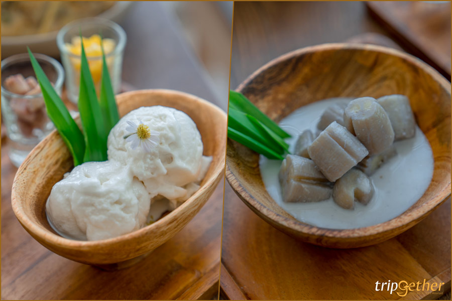 ปิดท้ายขนมหวานเบาๆ สักถ้วยด้วย กล้วยบวชชี และ ไอศกรีมมะพร้าว อัดท็อปปิ้งแน่นๆ