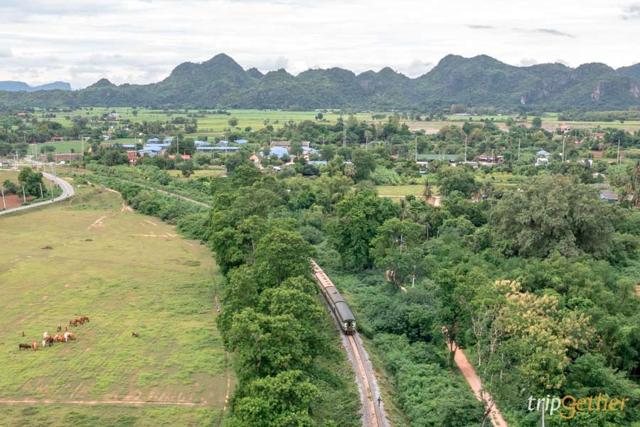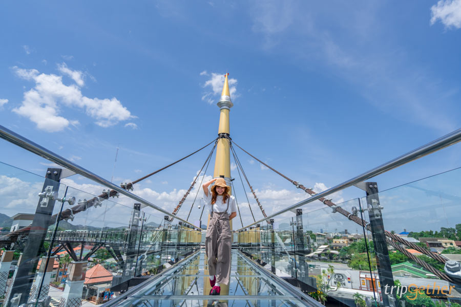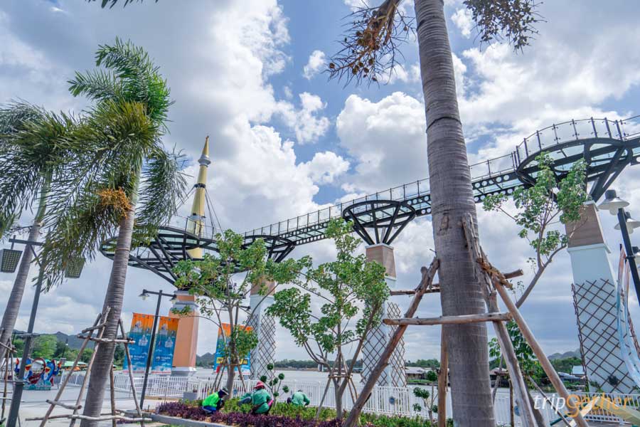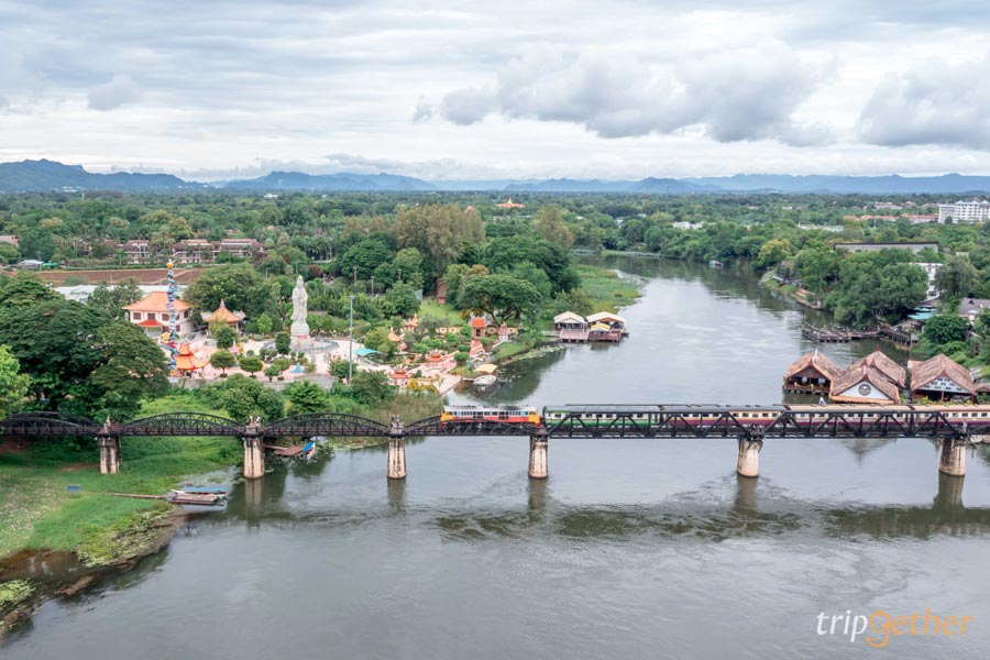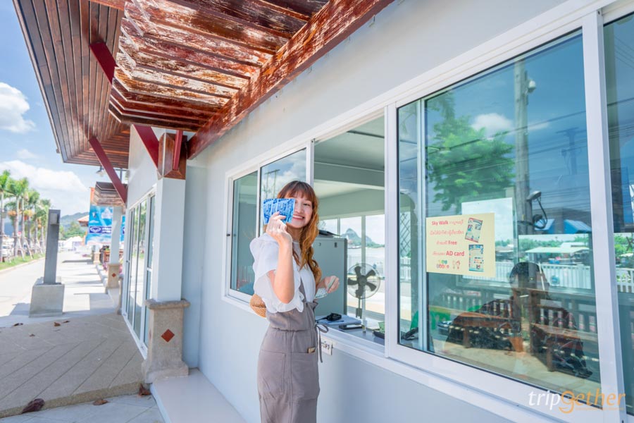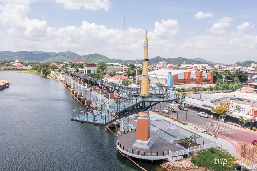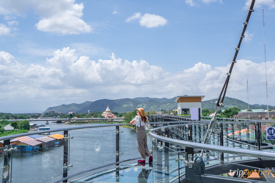 จากด้านบนสามารถมองเห็นวิวของแม่น้ำและทิวทัศน์ของแนวภูเขาที่โอบล้อมเมืองกาญจน์เอาไว้อย่างสวยงามเลยล่ะ แถมอากาศก็เย็นสบาย อยู่ที่นี่ได้แบบเพลินๆ โดยที่นี่ ไม่มีค่าเข้า แต่มีค่าบริการรองเท้าสำหรับเดินบนสกายวอล์คราคา 60 บาทคนไทย – ต่างชาติ ราคาเท่ากัน