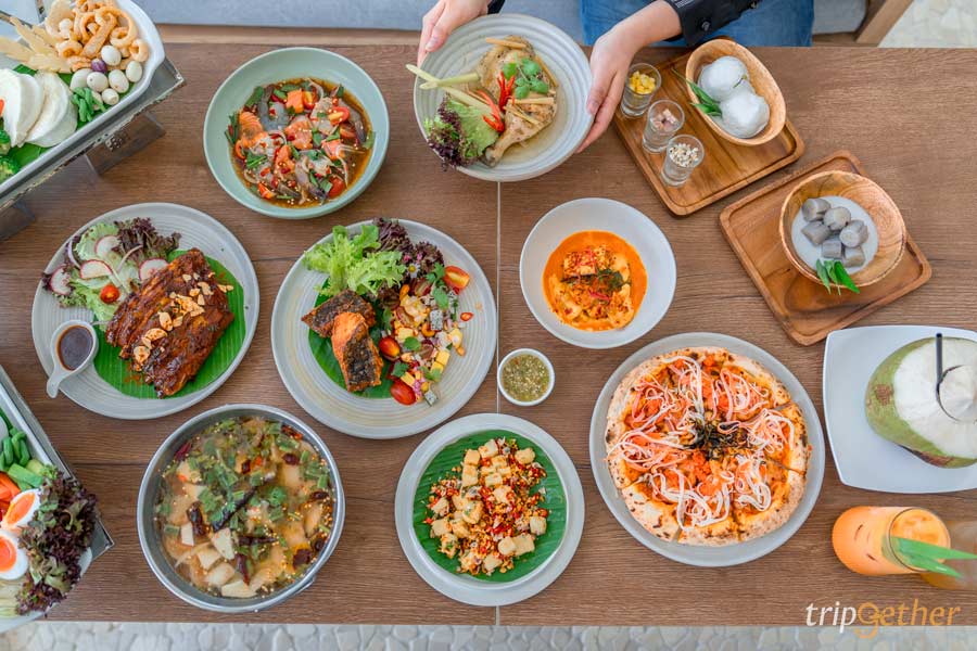 ในส่วนของเมนูเน้นเป็นอาหารฟิวชั่น โดยทางร้านมีเมนูให้เลือกหลากหลายทั้งอาหารไทยที่เป็นเมนูของจังหวัดกาญจนบุรี เช่น แกงป่า ผัดเผ็ด น้ำพริก และยังมีอาหารสไตล์ยุโรปอีกมากมาย บอกเลยว่าเราใช้เวลานานมากในการเลือกเพราะแต่ละเมนูน่ากินสุดๆ โดยเราสั่งเป็นเมนูซิกเนเจอร์ ชุดน้ำพริกสะพานแม่น้ำแคว ที่ทางร้านตั้งใจนำเสนอสัญลักษณ์ของเมืองกาญจน์ผ่านเมนูอาหาร ซึ่งภายในเซ็ตจะเสิร์ฟน้ำพริกกุ้งสดที่รายล้อมไปด้วยเครื่องเคียงหลากหลาย ทั้งผักสด ผักต้ม กุ้งลวก และปลาทูทอดตัวโตๆ