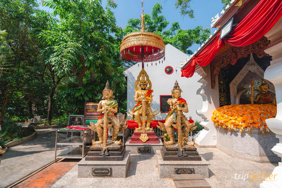 สุดท้ายคือการนำเอาทองคำเปลวไปติดที่องค์ท้าวเวสสุวรรณ ซึ่งองค์ท้าวเวสสุวรรณจะมีทั้งหมด 4 องค์ สามารถปิดทองได้ทุกองค์เลย