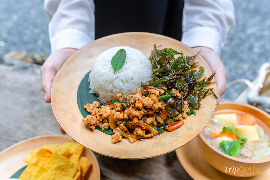 เดินเล่น ถ่ายรูปกันแล้วก็นั่งพักกินอาหารกลางวันกันได้เลย เมนูที่นี่หลากหลานมากไม่ว่าจะเป็นเครื่องดื่ม เบเกอรี่ และอาหาร ส่วนเมนูที่เราสั่งจะเมนูอาหาร เริ่มที่เมนูแรกเลยคือข้าวเหนียวไก่ทอด ราคา 180 บาท ไก่ทอดร้อนๆ ที่เสิร์ฟพร้อมกับข้าวเหนียวนุ่มๆ ในกระทงใบตอง ต่อด้วยเมนูถุงทอง ราคา 120 บาท ข้างในเป็นไส้กุ้งอร่อยมาก ส่วนตำผลไม้รสชาติจัดจ้านตัดเลี่ยนได้ดี ราคา 120 บาท กะเพราแซลม่อนราดข้าวถึงเครื่องกะเพราสุดๆ ราคา 150 บาท และปิดท้ายที่ข้าวผัดกุ้งอร่อยฟินอิ่มท้อง ราคา 120 บาท
