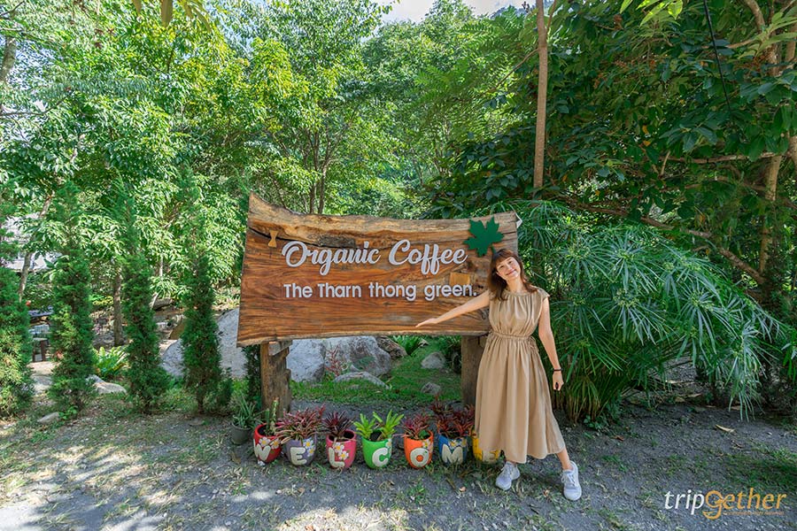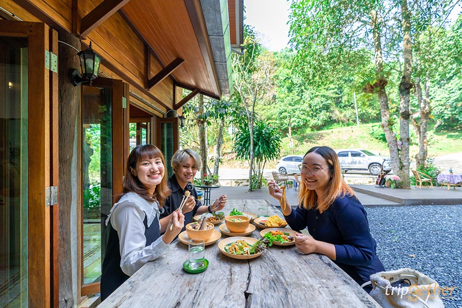 หลังจากที่เราใช้เวลากินลงชมวิวถ่ายรูปกันอยู่พักใหญ่เราก็ออกเดินทางไปจุดหมายต่อไปคือหมู่บ้านแม่กำปองเพื่อกินข้าวกลางวันกันที่ The Tharntong Green Coffee ใช้เวลาเดินทางเพียง 18 นาทีเท่านั้นเอง The Tharntong Green Coffee เป็นคาเฟ่ที่อยู่ติดกับลำธาร บรรยากาศบอกเลยว่าชิลล์สุดๆ เพราะตัวร้านล้อมรอบไปด้วยต้นไม้แสนร่มรื่น