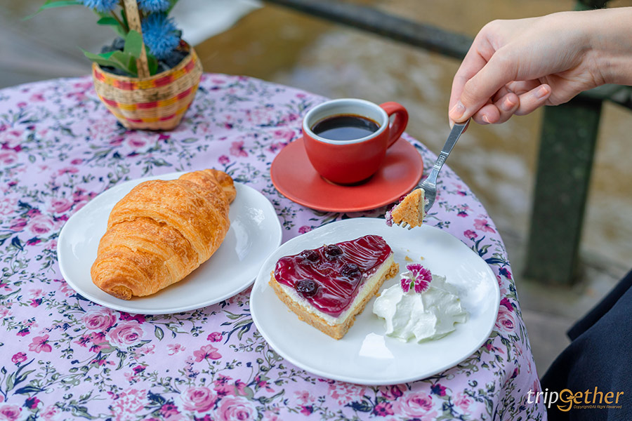 กินคาวไม่กินหวานก็ยังไงอยู่ ที่นี่มีโซนคาเฟ่ด้วยเราก็ปิดท้ายล้างปากด้วยของหวานกันซะเลย สั่งกันมาพอกรุบกริบ และเมนูที่เราสั่งคือ บลูเบอร์รี่ชีสพาย ราคา 85 บาท ครัวซองต์ ราคา 65 บาท และอเมริกาโน่ร้อน ราคา 65 บาท เราเลือกนั่งก็ที่ริมลำธาร บรรยากาศชิลล์มาก อากาศไม่ร้อนเลยแถมยังได้ฟังเสียงน้ำไหลจากลำธารเพลินๆ อีกด้วย