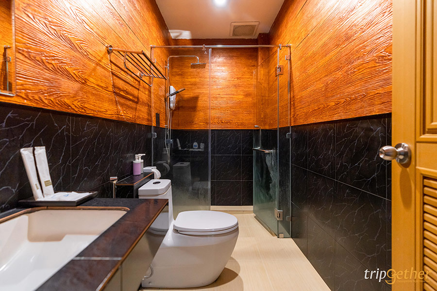 ห้องน้ำของที่พักแบ่งโซนเปียกโซนแห้งอย่างชัดเจน มีเครื่องทำน้ำอุ่น และสิ่งอำนวยความสะดวกจัดเตรียมไว้ให้พร้อมเลย