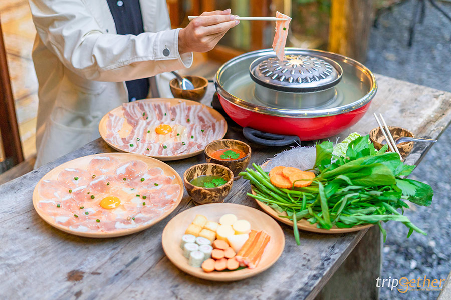 มื้อเย็นของเราได้เริ่มขึ้นแล้วหลังจากไปเดินเล่น ถ่ายรูป ย่อยอาหารเมื่อกลางวัน เย็นนี้เมนูของเราก็คือหมูกระทะ อากาศเย็นๆ กับหมูกะทะเข้ากันที่สุด เซ็ตที่เราสั่งมาจะมีหมูสามชั้น สันคอสไลด์ หมูนุ่มตอกไข่ และชุดลูกชิ้น ปูอัด เต้าหู้ปลา เต้าหู้ไข่ วุ้นเส้น และชุดผัก ส่วนน้ำจิ้มจะเป็นน้ำจิ้มสุกี้กับน้ำจิ้มซีฟู้ด เซ็ตนี้ราคา 399 บาท