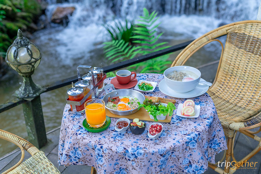เริ่มต้นเช้าวันใหม่ด้วยการกินมื้อเช้าริมลำธาร อาหารเช้าของเราจะเป็นเซ็ตข้าวต้มและเซ็ตไข่กระทะ สามารถเลือกได้เลยว่าจะกินเซ็ตไหนดี ส่วนเราก็เลือกมาทั้งสองเซ็ตเลย