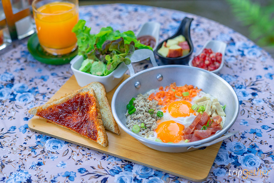 เซ็ตไข่กระทะ จะเสิร์ฟพร้อมขนมปัง สลัด ผลไม้ และน้ำส้ม ไข่กระทะเครื่องแน่นแบบจัดเต็มสุดๆ