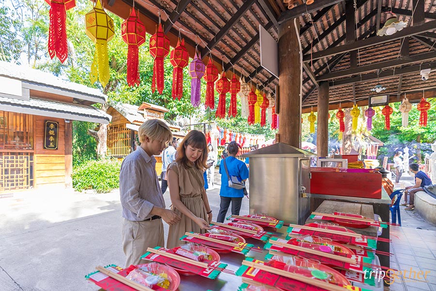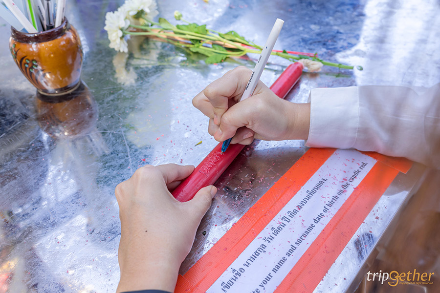 เทียนสีแดงนี้ให้เราเขียนชื่อ วันเดือนปีเกิด แล้วขึ้นไปไหวพระบนวิหารก่อนจะนำลงมาจุดด้านหน้าวิหารอีกที