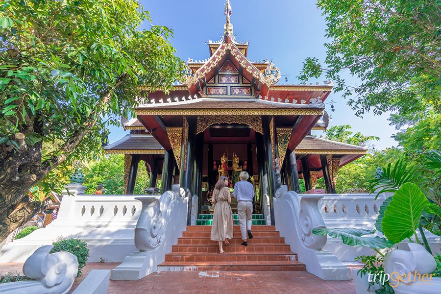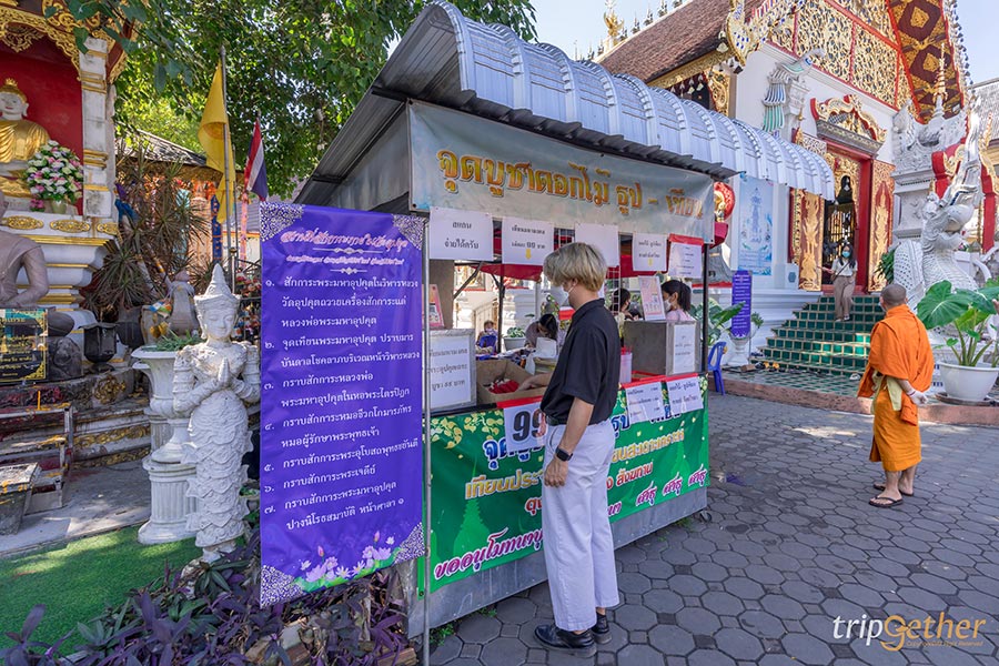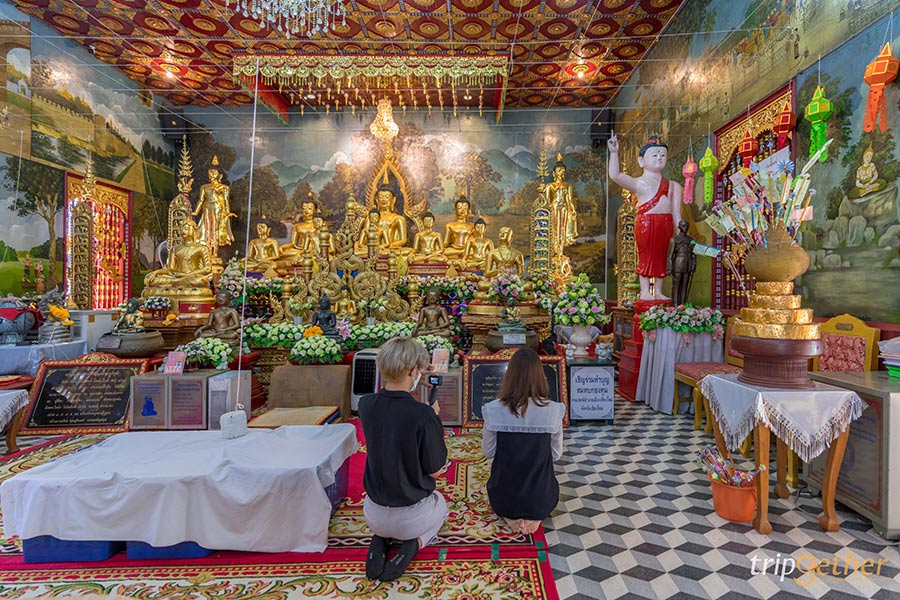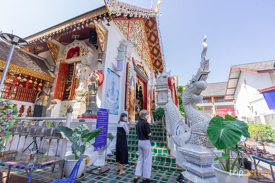 พร้อมแล้วก็ออกเดินกันต่อเลย เราจะพาทุกคนไปมูกัน เพราะทริปนี้คือทริปสายมู เริ่มกันที่วัดอุปคุตวัดดังอีกแห่งหนึ่งในเชียงใหม่ ตั้งอยู่ใกล้ๆ กับตลาดวโรรส ที่วัดนี้มีผู้มาคนกราบสักการะขอพรพระอุปคุต พระพุทธรูปศักดิ์ที่ประดิษฐานอยู่ในพระวิหาร ใครที่อยากมามูเรื่อง การงาน การเงิน โชคลาภ และความเจริญรุ่งเรืองต้องมาที่นี่เลยปังแน่