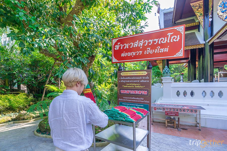 เริ่มต้นความปังกันที่ทำบุญชุดไหว้ขอพรสำเร็จทันใจ ชุดละ 150 บาท เมื่อได้ชุดไหว้มาแล้วก็นำมาเขียนชื่อใส่กระดาษ จากนั้นก็จุดธูปไหว้อธิษฐานขอพรในสิ่งที่เราต้องการ ตามด้วยเติมน้ำมันตะเกียง พร้อมกับจุดเทียน และใช้กระดาษปัดสะเดาะเคราะห์ออกจากตัวเรา 13 ครั้ง จากนั้นก็นำกระดาษวางไว้ที่จุดวางไม่ต้องนำไปเผาเพราะจะมีเจ้าหน้าที่นำไปเผาให้
